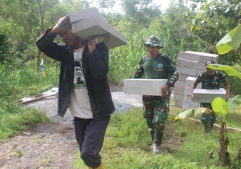 Di tengah terik matahari yang membakar kulit dan jalanan tanah yang menantang setiap langkah, anggota Satgas memanggul material bangunan seakan mengangkat harapan setinggi langit. Batu demi batu, bata demi bata, dipindahkan dengan semangat yang membara—seolah kelelahan tak pernah mengenal nama mereka.